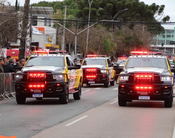 O início da participação da PMPR foi marcado pelo entusiasmo dos grupamentos escolares. Os cadetes da Escola de Formação de Oficiais (EsFO) da Academia Policial Militar do Guatupê (APMG) abriram a apresentação, seguidos pelos pelotões de alunos do Colégio da Polícia Militar (CPM).Em seguida, a Banda de Música da PMPR emocionou o público ao executar o Hino da Independência, estabelecendo o compasso para a marcha das tropas. O corpo de policiais militares contou com representações do Comando de Missões Especiais (CME), do Comando de Policiamento Especializado (CPE), além do 1º e do 6º Comando Regional de Polícia Militar (CRPM), responsáveis pelo policiamento em Curitiba, Região Metropolitana e Litoral.O desfile prosseguiu com a apresentação motorizada, que exibiu viaturas, motocicletas, blindados e embarcações utilizadas no cotidiano da Corporação. Entre os destaques estiveram as novas caminhonetes RAM 3500 Longhorn, que estão sendo incorporadas à frota da PMPR, que chamaram a atenção do público pela imponência e robustez, reforçando a modernização dos recursos empregados na segurança pública do Estado.Além de desfilar, a Polícia Militar também atuou no bloqueio de vias e no policiamento das imediações, garantindo a segurança e a tranquilidade do público que acompanhou a solenidade.